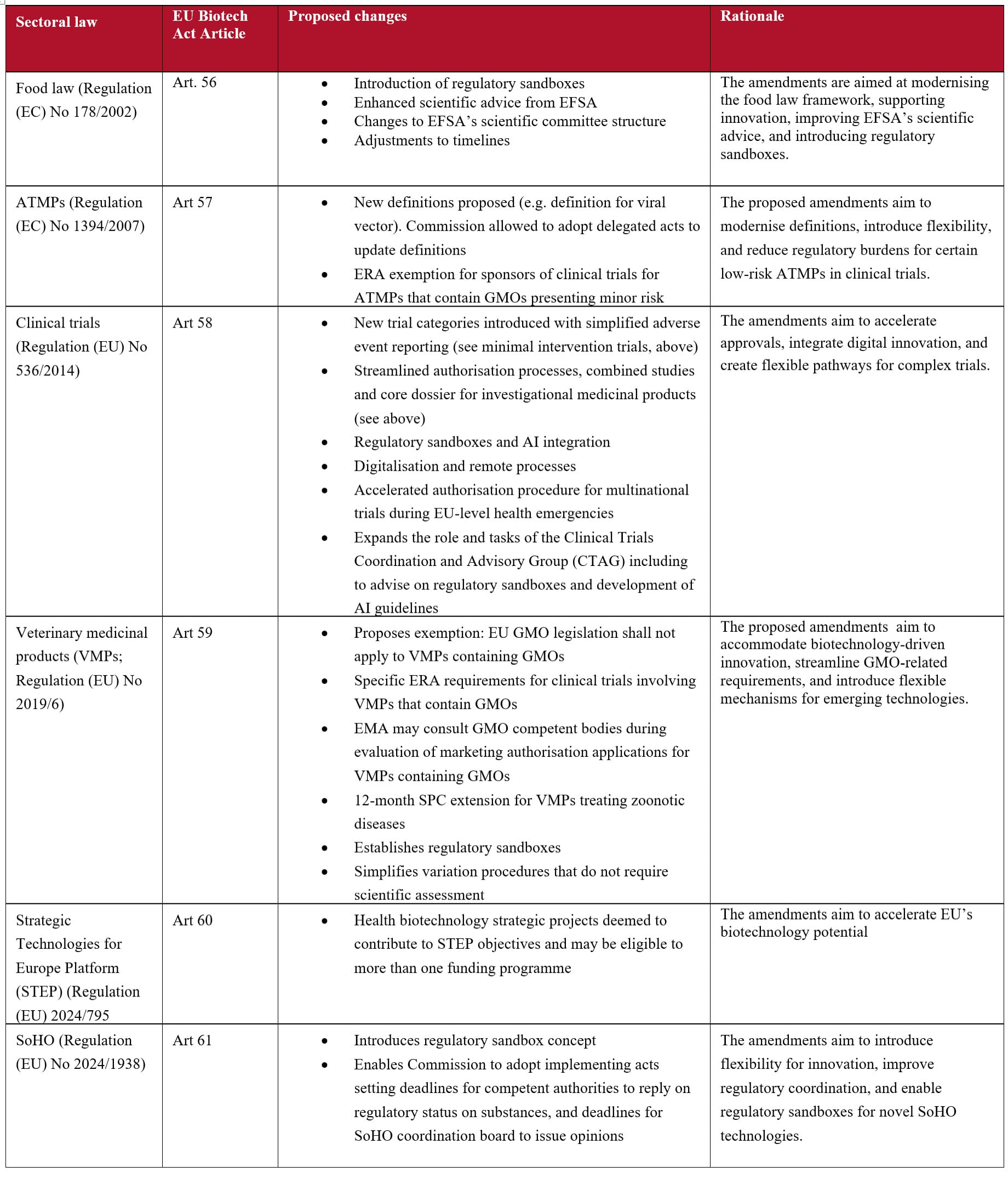 Additional proposed changes are outlined in the table below, which provides a summary of amendments to the Clinical Trials Regulation and other related sectoral regulations.